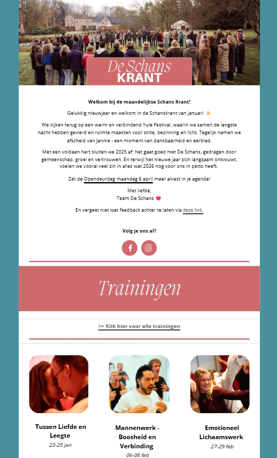 Domein de Schans is a sanctuary for personal growth and deep connection, nestled in a setting that inspires and rejuvenates. Through transformative workshops, healing ceremonies, and wellness retreats, individuals are invited to reconnect with themselves and others. Our goal is to reflect the warmth and essence of Domein de Schans, encouraging more people to discover and experience its unique offerings. We even created Equilibrium Festival, to attract a younger target audience. Say what?!